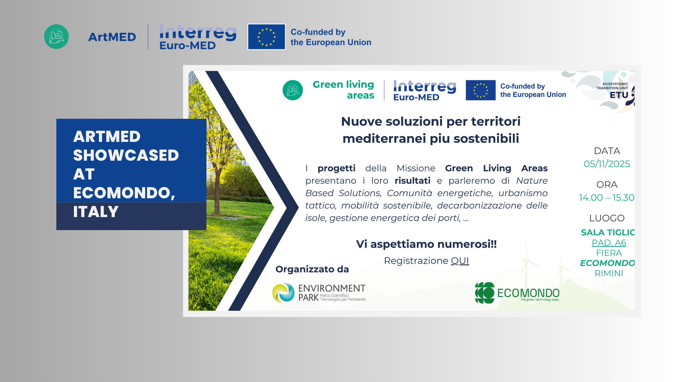 On 5 November 2025, ArtMED was presented at ECOMONDO (Rimini, Italy) during the conference session “New solutions for more sustainable Mediterranean territories – Presentation of the initial results of the Green Living Areas mission projects”, organised by Environment Park (Turin). ArtMED was represented by Ilaria Leonardi (ALOT S.r.l.), who joined a panel session with a PPT presentation titled: “ArtMED – Planning for Autonomous Mobility on Demand in the Interreg Euro-MED Area.” During the panel, the speaker shared the current status of the project and its main outputs, highlighting how ArtMED supports regions and local stakeholders in planning next-generation Autonomous Mobility on Demand (AMoD) and Demand-Responsive Transport services through evidence-based decision support (including the project’s tool and methodologies). The session brought together an audience of public authorities, researchers, operators, and SMEs (estimated 16 participants), creating space for discussion on practical, replicable solutions for more sustainable Mediterranean territories within the Green Living Areas Mission framework.